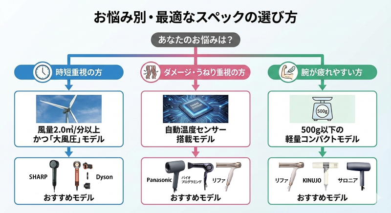 前述のランキングで紹介したモデルが、具体的にどのタイプに当てはまるのかを確認しながら、あなたにぴったりの1台を見つけてください。