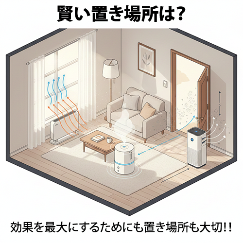 - 【空気清浄機】:玄関の近く、または空気の通り道に。