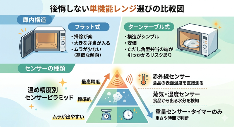 単機能レンジはどれも同じに見えますが、実は「センサー」と「庫内構造」の組み合わせで、日々の家事の負担が大きく変わります。後悔しないための3つのチェックポイントを確認しましょう。
