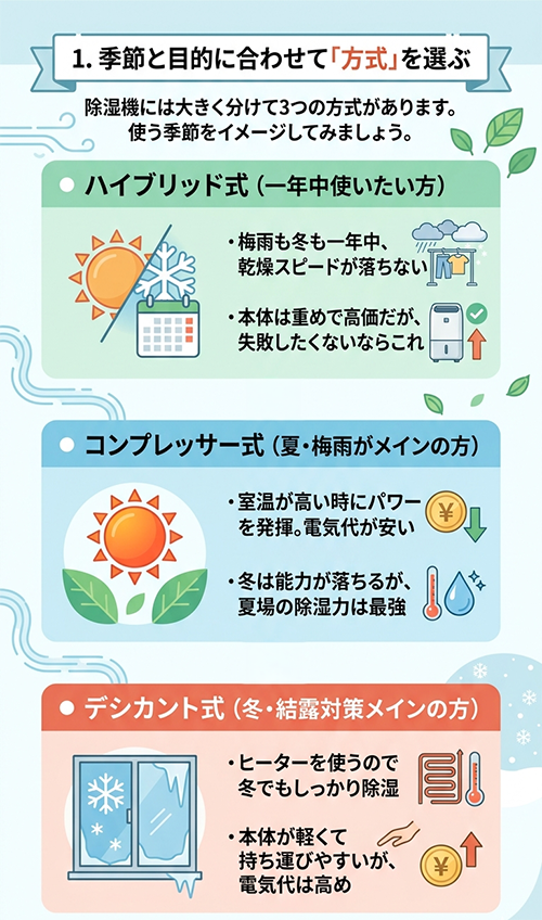 除湿機には「コンプレッサー式」「デシカント式」「ハイブリッド式」の3種類があり、それぞれ得意な季節が異なります。
