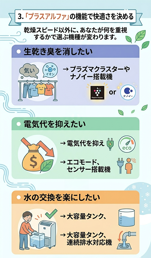 特に「生乾き臭」が気になる方は、シャープのプラズマクラスターやパナソニックのナノイーといった、菌の繁殖を抑えるイオン放出機能付きが必須です。また、共働きで長時間家を空けるなら、タンクが満水になって止まってしまわないよう、大容量タンクを備えたモデルや、お風呂場などで直接排水できる連続排水機能付きを選ぶと、水捨ての手間から解放されます。