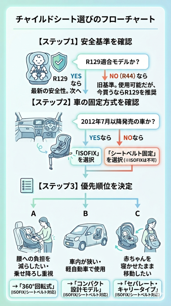 チャイルドシートは一度買うと数年使い続けるものです。単なる価格やデザインだけでなく、以下の4つのポイントを軸に検討しましょう。