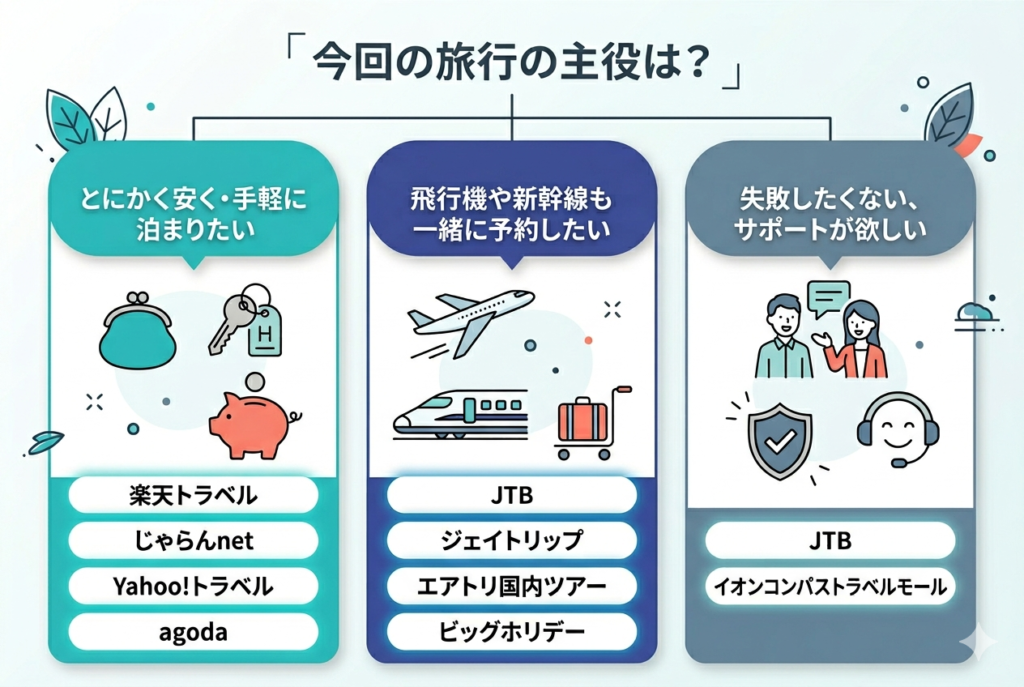 宿だけを探しているなら、掲載数が多い「楽天トラベル」や「じゃらん」が圧倒的に便利です。一方で、飛行機や新幹線を伴う遠出なら「JTB」や「ジェイトリップ」のような、交通機関と宿がセットになったパッケージツアー型の方が、トータルコストを2割〜3割ほど抑えられるケースが非常に多いです。